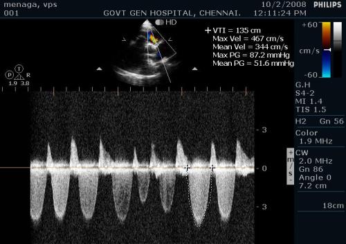 Note the peak TR jet is around 50mmhg and predicted RVSP would be 60mmhg.One would have expected still higher RV pressure but since the RV is dysfunctional the true PAP may be underestimated.