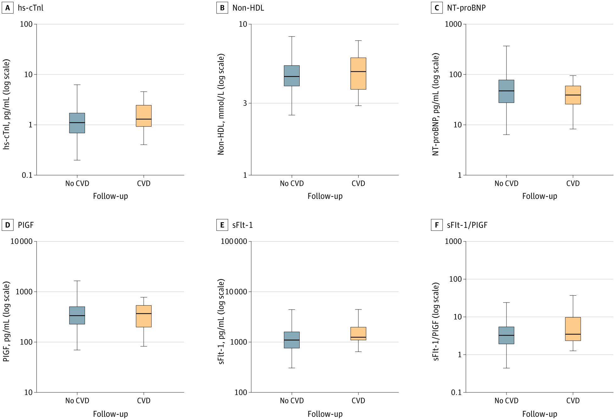 Boxplots show the distribution of biomarker concentrations, stratified by the occurrence of CVD during follow-up (FU), at gestational week 29 on a logarithmic scale. Horizontal lines within boxes indicate median values, boxes represent interquartile ranges (IQR; calculated at Tukey hinges), and whiskers denote the 5th to 95th percentiles. Outliers are not shown. hs-cTnI indicates high-sensitivity cardiac troponin I; NT-proBNP, N-terminal pro-B-type natriuretic peptide; PlGF, placental growth factor; sFlt-1, soluble fms-like tyrosine kinase-1; HDL, high-density lipoprotein cholesterol.