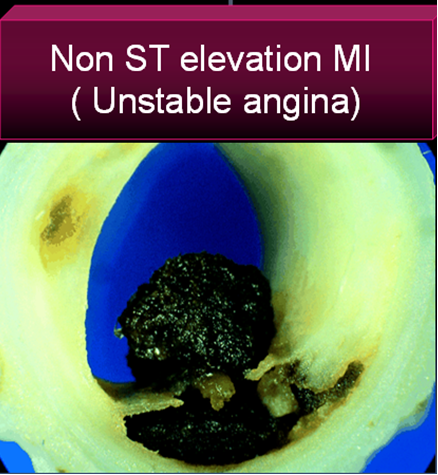 3.Further in UA/NSTEMI since it is a slow and gradual occlusion (Unlike sudden & total occlusion in STEMI) the platelets  get marginalised and trapped within the plaque .Hence in UA  thrombus is predominantly  white  . Often, a central platelet core  is  seen over which fibrin clot may also be  formed.