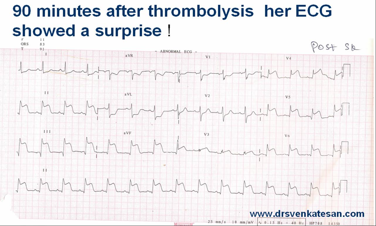After thrombolysis , the paradox happened . ST elevation increased by 4mm and soon the patient became restless with worsening pain and became silent instantaneously , with monitor showing EMD and asystole .A diagnosis of free wall rupture was made.