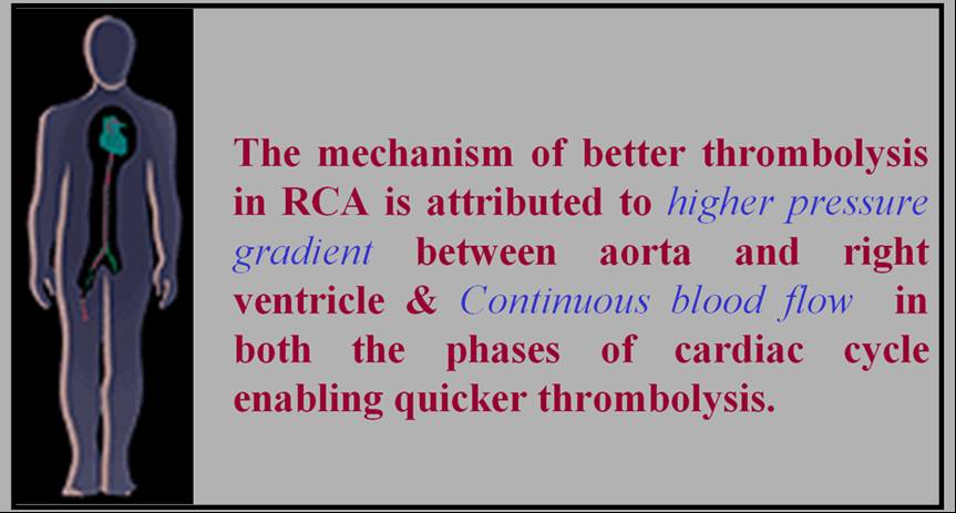 The mechanism of better thrombolysis in right coronary artery  is simple.The success of thrombolysis , apart from early time window , is directly correlated with pressure head  and the duration of contact between the thrombolytic agent and the thrombus. In right coronary circulation the  blood flow is continuous ,  occurs  both in systole and diastole that facilitates the maximum delivery of the thrombolytic agent . Further there is a favorable  pressure gradient  across RV myocardium  as the transmural occluding pressure across RV is considerably less then LV myocardium.