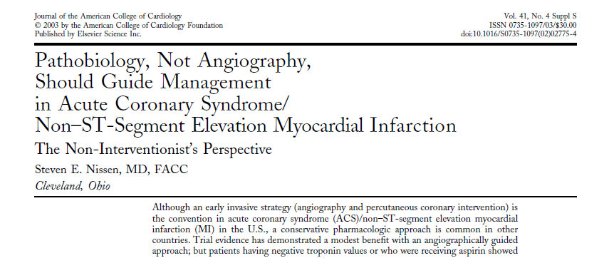 Here is an article,  which excellently depicts the principles of management of ACS.  It was published in 2003 JACC,  by Steven Nissen  from Cleveland,  Ohio .It deserves more attention . Every cardiologist , involved in ACS management should read this, especially the interventionist.
