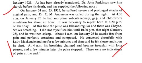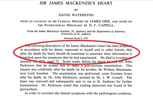 Apart from his stupendously successful academic life, it was through his death, that he sent out an extraordinary message to the scientific community. His deep desire to know the truths about coronary atherosclerosis was astonishing. Since he himself was suffering from angina and possibly Infarct, he became his own subject of study. He became case number 28 in his own book on cardiology. When he was on his death bed, as a last wish he Insisted his colleagues do a learning post-mortem and keep his heart in the same hospital he worked. When he died in the early morning of January 25th, 1925, as per his wish, his students Dr. Parkinson,(WPW fame) and another pioneer Dr.Thomas Lewis did an autopsy on his heart.