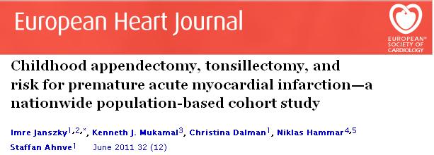 This article just released  in  European heart journal , tells us ,  how the rampant use of appendectomy and tonsillectomy in the early child hood  may make them susceptible for CAD in later age group.