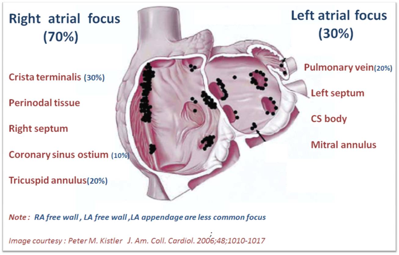 For right or wrong reasons, the world of electrophysiology has pushed us into a belief system that, if it is AF, the culprit must be pulmonary veins. In fact, non-pulmonary vein origins can be a staggering 70% in some series. (See below) It can be in the free walls of the left atrium, LA appendage, IAS, IV, SVC junctions, coronary sinus, ligament of Marshall, crista terminalis, etc. (Ref 2)