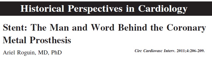 Later on , the name Stent came into vogue . Surprisingly stent is not a technical name . It is a name of British dentist. To know more about the historical aspects of coronary stents read the following review from Circulation.