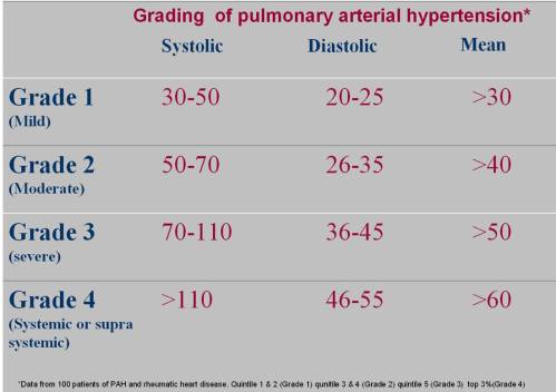 Developing countries like ours have a great number of PAH due to rampant rheumatic heart disease.  A simple study was done in  100 patients with PAH .Bulk of the study population had RHD .Few had primary pulmonary  hypertension .Systolic , diastolic, and mean pressure was assessed by doppler echocardiographic analysis of tricuspid regurgitation (TR) and pulmonary regurgitaion(PR) jets. TR jet provided the systolic PA pressure , PR jet provided mean as well as diastolic PA pressure .TR jet was available in all patients. PR jet was available only in 60 patients .Hence the diastolic andmean PA pressure data has been extrapolated in some  and  was plotted in a scatter diagram. Five equal quintiles were divided. Patients in first  and 2nd quintiles were graded 1   and third  and 4th  quintile were  graded 2 ,  5 th  was graded 3 respectively. From this cut off points for  various grades of PAH were identified .The top 3% of patients  with highest PAP were graded as grade 4 and all of them had supra systemic PAH.