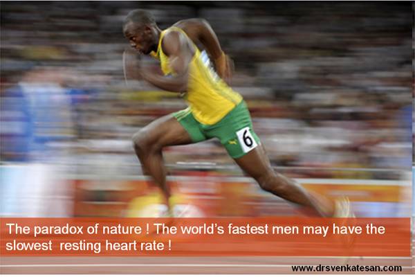 ECG of an athlete is many times difficult to interpret. The influence of autonomic tone in athlete’s heart is an complex one.Contrary to our expectations the parasympathetic tone is higher in well trained athletes. The resting heart rate can be as low as 30/mt which is 99.9 times pathological in non athletes.This happens due to a concept called accentuated antagonism.The athletes who have episodic surge of high catecholamines keep stimulating the para sympathetic neurones in a constant fashion.