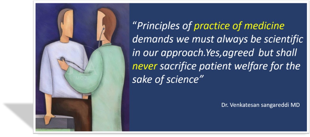 We realize wide gaps between academia, patient care, and research are the norm, not an exception. One reason for this is, even well-learned medical professionals find it difficult to comprehend, that the practice of medicine is essentially an art, administered with love, care, service-mindedness. A cost-effective infrastructure with an immense amount of teamwork is critical ( Of course, guided by a fair amount of knowledge, expertise based on good scientific principles)