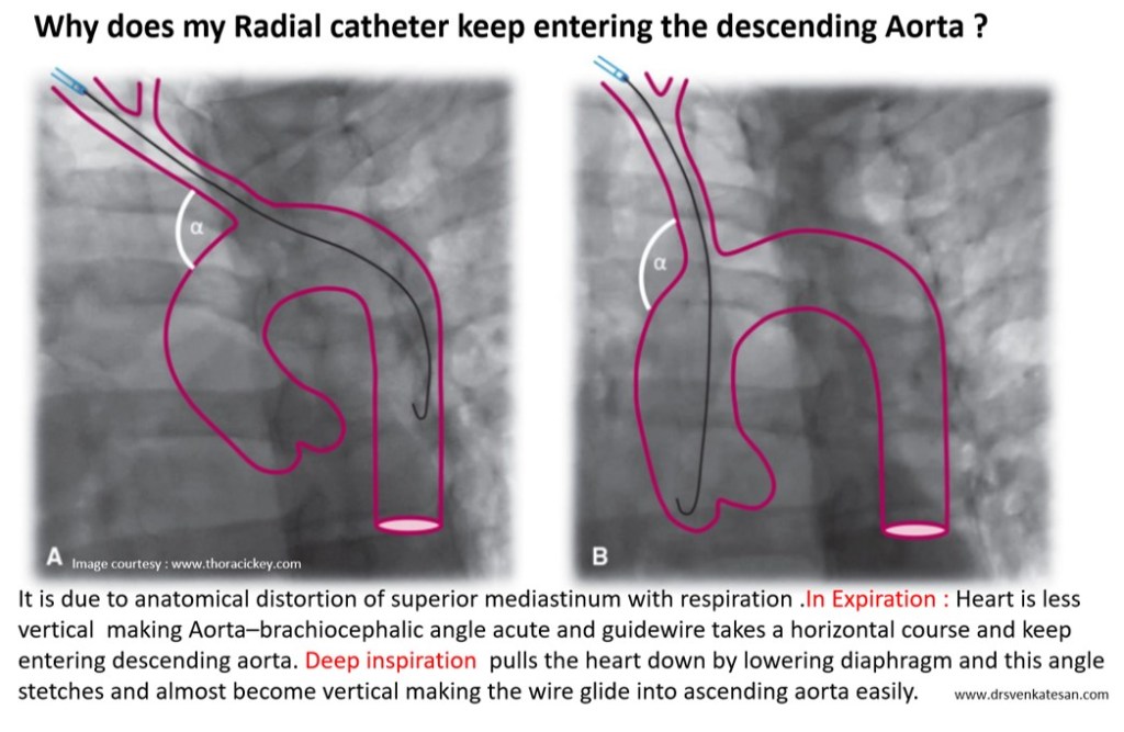 The commonest cause* for repeated entry of right radial catheter to descending aorta is not due to any anomaly. Most times,it is just a skewed angle between right brachio-cephalic artery with Aortic arch, that deflects the catheter to the descending aorta . Just make sure, aortic root is entered with a deeply held inspiration.