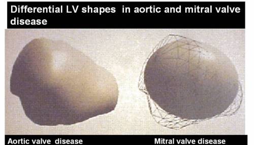 LV enlargement due to mitral regurgitation is somewhat different from aortic regurgitation. A globular configuration occurs more often in severe MR than AR. This is due to the fact, the long axis and short axis ratio of LV  is maintained till late in the course  of aortic valve disease . Cardiac long axis enlargement is more pronounced in aortic valve disease than in MR. The AR jet reaches LV  at a higher pressure gradient (Diastolic pressure of aorta) than mitral inflow velocity . (Often mimic physiological flow with an S3)