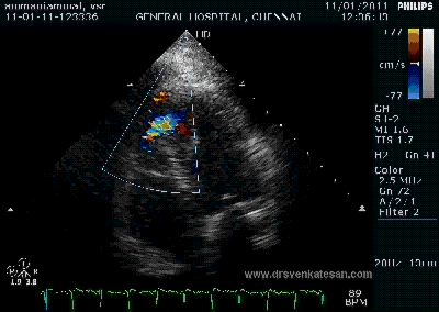 Color flow showing significant shunting from LV to RV.This shunt depends upon the LV contractile function, LVEDP and ofcourse the RV pressure
