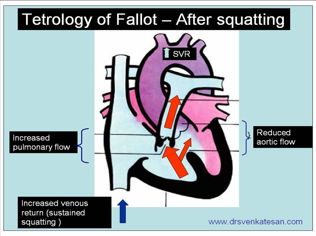 The net effect of squatting is there is a transient or sustained (as long as child squats) increase in pulmonary blood flow and this is made possible by the relative reduction of right to left shunt as the aortic and systemic resistance is raised by this posture.
