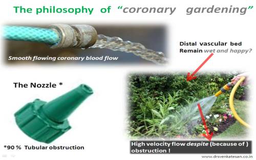 * The garden hose analogy is a gross simplification of complex factors that determine coronary blood flow.But it effectively clarifies a point ie coronary blood flow is least dependent on coronary stenosis (until very late stages)